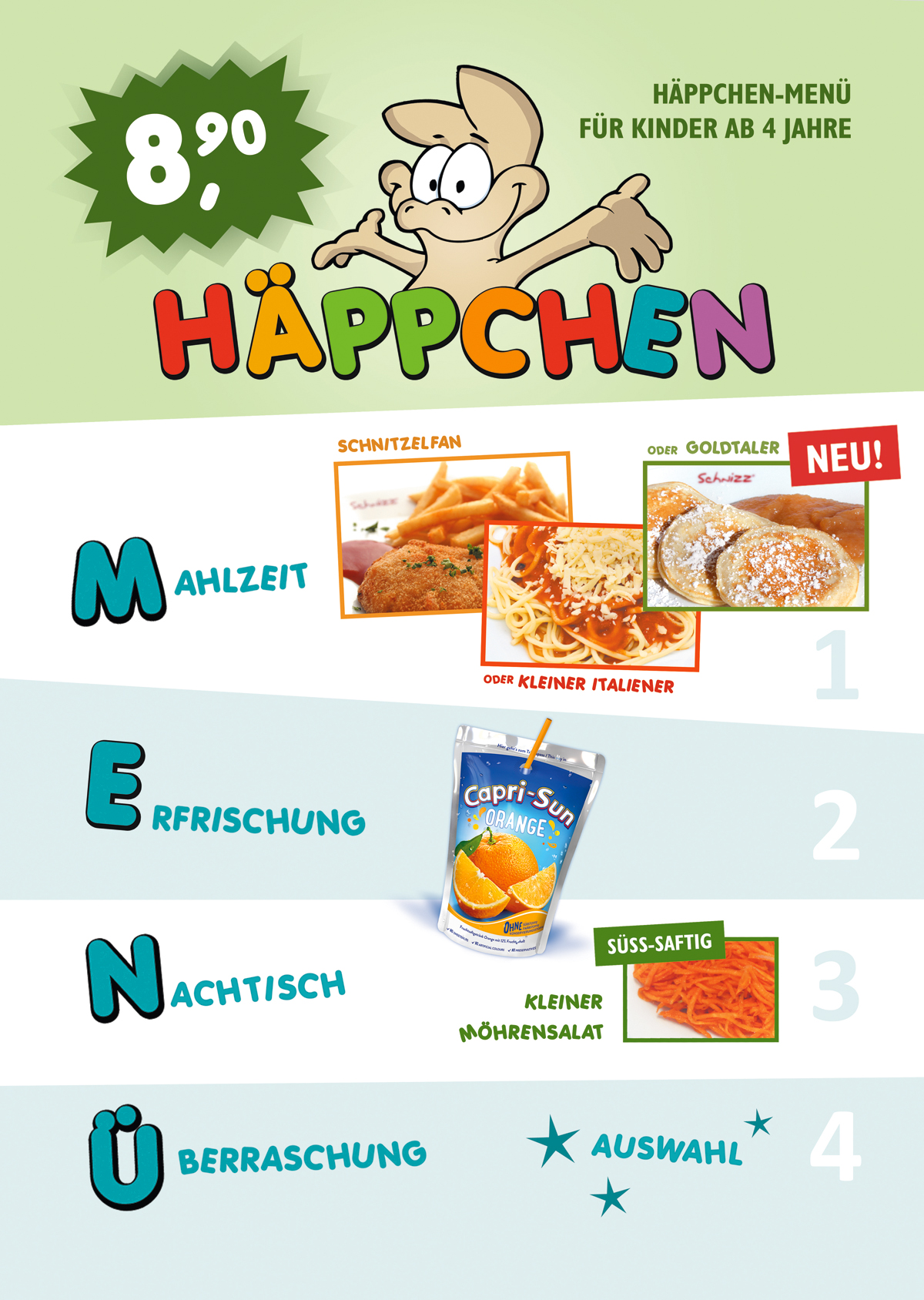 Speisekarte · Mittagsmenü · Allergene Essen mit Kindern · Häppchen-Menü Schwein-Pute-Kalb · Veggie Schnitzel Frischegarantie · Partner · Qualitätsbetrieb Jobs · Presse · Expansion · Standorte |