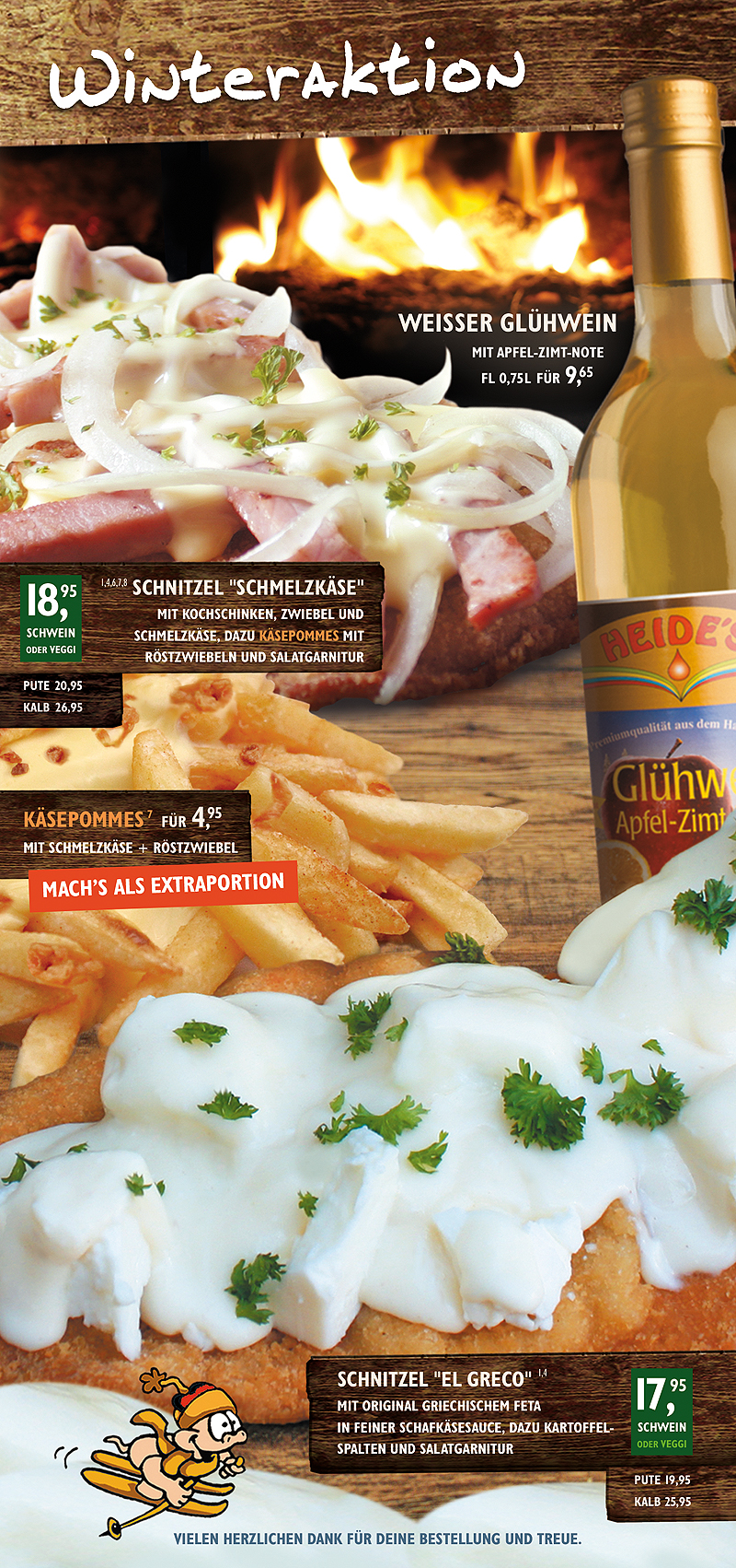 Das Schnitzel "Schmelzkäse" mit Käsepommes oder das Schnitzel "El Greco" mit Original griechischem Feta. Dazu empfehlen wir den "Weißen Glühwein" mit Apfel-Zimt-Note.